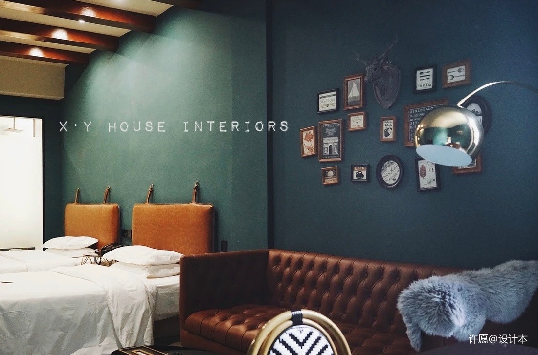 其中一套親子房設(shè)計成鄉(xiāng)村休閑風(fēng),復(fù)古木紋、石頭壁爐、咖色皮紋座椅、鏤空鹿頭、咖色地毯等同一色相不同純度、不同明度的色彩空間組合,和諧舒適, 客人在進入空間后,便能沉浸在休閑舒適的空間中,隔絕外部的繁雜。