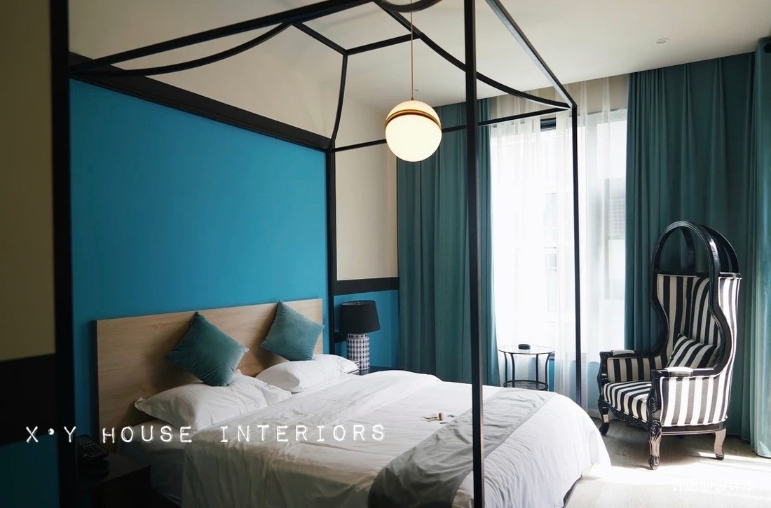 另有部分客房以‘時尚’為主題,時尚而精致,房間通過局部墻面色、窗簾、家具等軟裝的色彩搭配來營造不同時尚感的客房。民宿三層原始建筑5.6米的層高為客房的打造提供了一個契機,極大地豐富了豎向上的空間體驗。下圖是親子房,同樣是5.6米挑高房型,面積更大一些,局部分隔成了兩層,上次休息睡覺、下層休閑娛樂,并在房間里設(shè)計了不同造型的木質(zhì)滑滑梯。