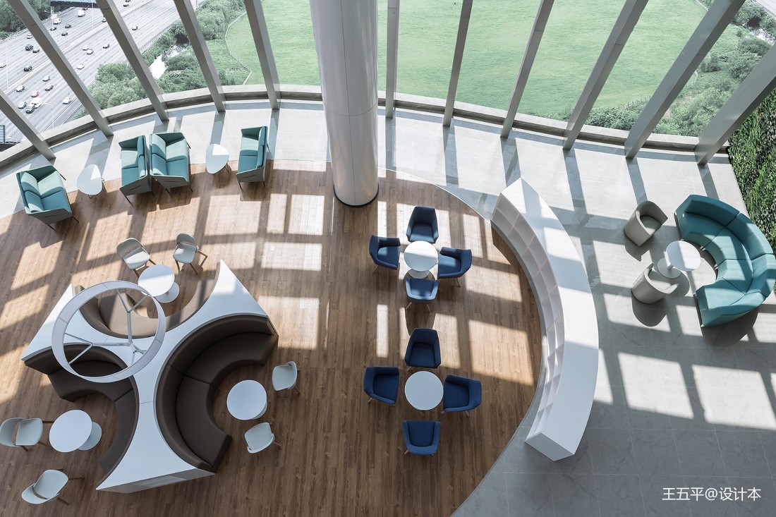俯瞰空間,光陰交織,線面糅合。曲線元素打破呆板和無趣,賦予空間多變性。弧度背景緩解空間突兀感,將空間柔化,并貫穿空間每一個角落。簡單而充滿未來感的燈具,在低調中,卻成為另一亮點,迸發著設計師的創意與靈感。開放式的空間,辦公、洽談或是端詳風景,洋溢著的高端與時尚,溢于言表。
